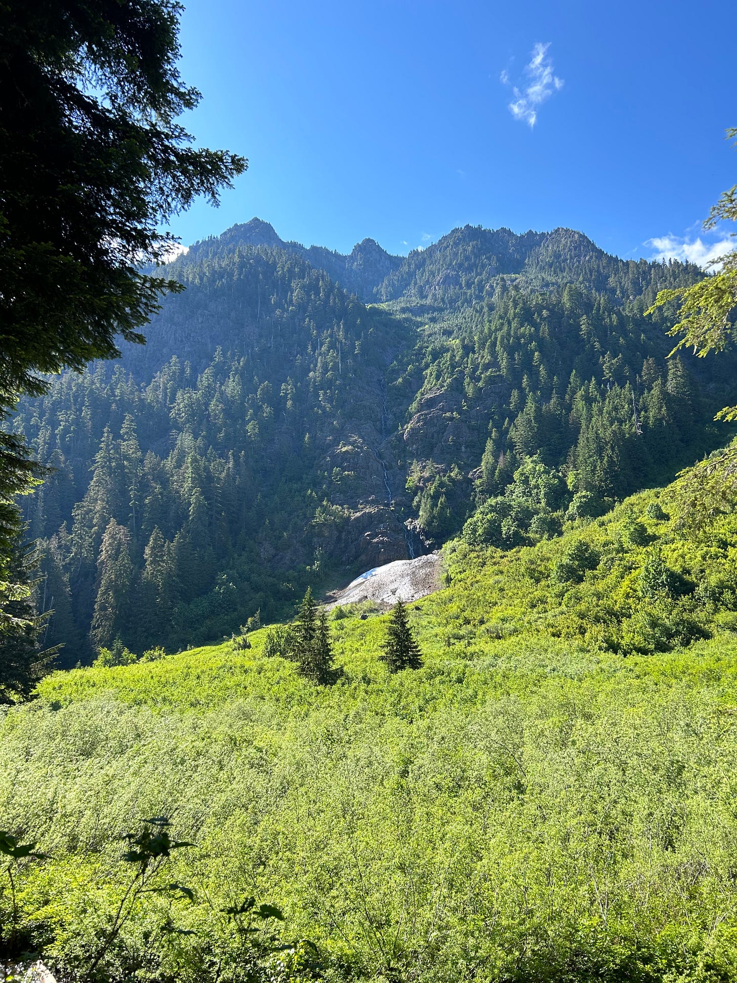 It was at this moment the trail opened up to a beautiful meadow, surrounded by mountains, with cascading waterfalls surging off the cliffs and a snowfield in the distance. A creek babbled happily right below the trail, with fluttering moths and butterflies floating in the faint breeze, dragonflies zooming this way and that. Birds were singing merrily, and the sun was casting a golden glow on everything around me.